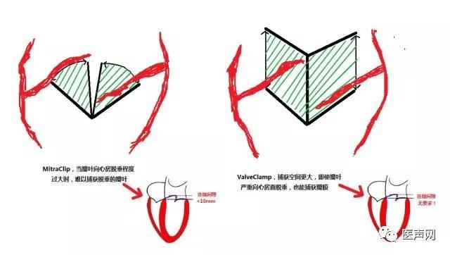 圖1 ValveClamp和MitraClip技術(shù)原理和捕獲范圍的比較