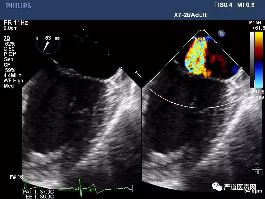 高齡老年男性患者,超聲提示二尖瓣后瓣及前瓣脫垂伴重度反流,有明確臨床癥狀,反復(fù)出現(xiàn)心衰臨床表現(xiàn),并具有多種合并癥。經(jīng)過討論,該患者行傳統(tǒng)外科手術(shù)風(fēng)險較高,選擇性微創(chuàng)ValveClamp治療。圍手術(shù)期經(jīng)食道超聲(TEE)確認二尖瓣退行性病變,前瓣后瓣A2/P2脫垂伴重度反流,脫垂區(qū)域?qū)挾?2mm,手術(shù)采用全麻左前胸3cm微創(chuàng)切口,通過心尖如路16F血管鞘完成,無需體外循環(huán)及心臟停跳,在TEE引導(dǎo)下準確將上海捍宇醫(yī)療創(chuàng)新研發(fā)的ValveClamp準確釋放于A2/P2脫垂區(qū)域,行介入緣對緣(edge-to-edge)修復(fù),整個手術(shù)過程順利,植入時間僅25分鐘,無明顯失血,術(shù)后TEE提示二尖瓣反流即刻為極微量,二尖瓣雙孔化形成,二尖瓣平均跨瓣壓差僅為2mmHg,瓣口無狹窄,臨床效果滿意。
