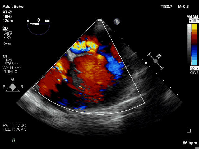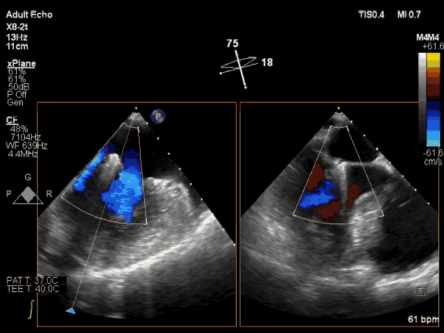 此次轉(zhuǎn)播心臟超聲機(jī)器為最新一代Philips EPIQ 7C,使用X8-2t食道探頭進(jìn)行術(shù)中經(jīng)食道超聲,采用TrueVue實(shí)時(shí)三維雙容積視野同時(shí)顯示二尖瓣左房觀和左室觀。新一代超聲機(jī)器分辨率高、圖像處理速度快、圖像界面舒適,使得手術(shù)非常順利,手術(shù)轉(zhuǎn)播的導(dǎo)管操作時(shí)間僅用8分鐘?;颊咝g(shù)后即刻效果滿意,反流從重度減少到輕度。