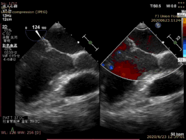 第二例為女性老年患者,因活動(dòng)后氣促、心臟雜音3年余入院,超聲心動(dòng)圖評(píng)估為二尖瓣后葉P2脫垂、P2偏P1處細(xì)小腱索斷裂伴重度反流,心外科會(huì)診認(rèn)為開胸手術(shù)高風(fēng)險(xiǎn),STS評(píng)分為6.1%。該患者同樣在全麻下植入一枚ValveClamp夾合器,術(shù)后即刻顯示二尖瓣反流降至輕度,手術(shù)用時(shí)更少,且無(wú)手術(shù)并發(fā)癥發(fā)生。